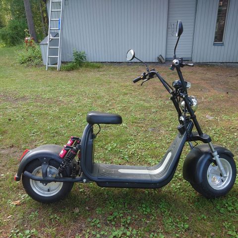 Sähköskootteri harmaalla värillä, varustettu kahdella istuimella. Sopii kahdelle henkilölle. Kevyt ja helppokäyttöinen malli, soveltuu lyhyisiin kaupunkimatkoihin.