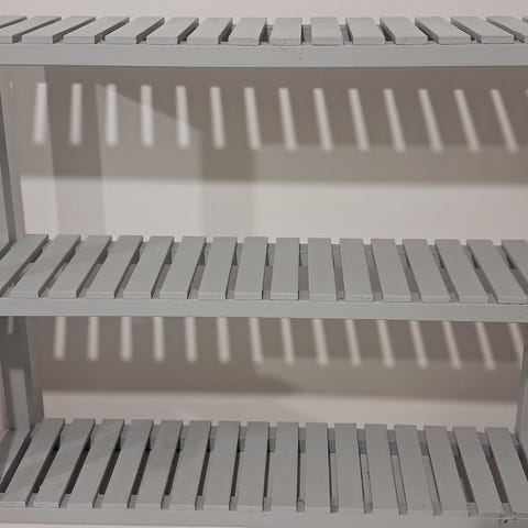 Varastossa vuosia lojunut käyttämätön seinähylly. Muovit osin vielä päällä. Muovittomista kohdista voi löytyä pientä naarmua. Kuvassa tarkemmat tuotetiedot.