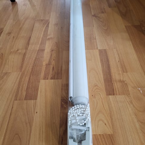 Valkoinen pimentävä rullaverho. Kavennettava malli, kavennettu 54cm leveys mittaan.