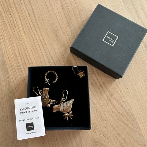 Kalevala Korun Hattulan lintu -korvakorut. Täysin avaamattomassa paketissa eli töysin uudenveroiset, en vain tiedä koska ne on ostettu.