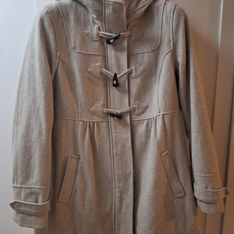 Siisti ja vähän käytetty Trendy line -merkkinen a-linjainen villakangastakki. Ei nyppyyntymistä havaittavissa. Takana kauniit laskokset. Ostettu Haloselta.