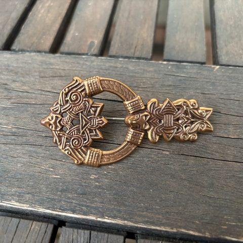 Kyseessä on Kalevala Koru -rintakoru, todennäköisesti malli nimeltä "Viikinkiaikainen solki" tai vastaava pronssinen rengassolki.