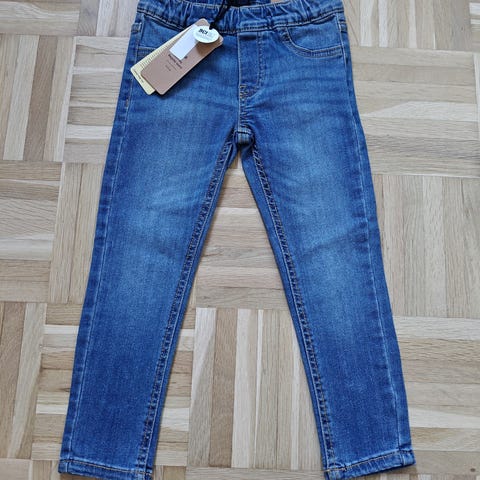 Lindexin farkut kokoa 98. Vyötäröllä säädettävä kuminauhajousto. Vyölenkit. Vetoketju ja painonappi. Avonaiset etu- ja takataskut.