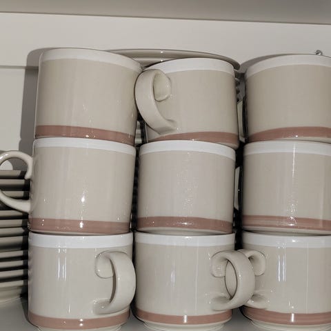 Arabia Koralli mukit ja aluslautaset. Kunto hyvä, käytetyt, mutta ei kulumajälkiä. Hinta 125 €/setti.