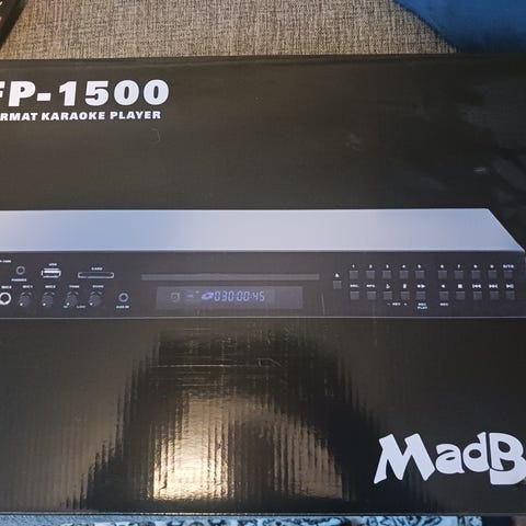 MadBoy FP-1500 karaoke-soitin. Mukaan kaksi mikrofonia. Laite on tarkoitettu karaokekäyttöön ja tarjoaa perustoiminnot äänen toistoon ja mikrofonin liittämiseen.