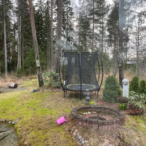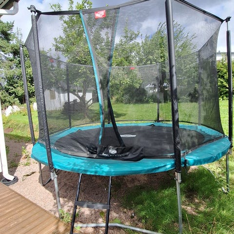 Pyöreä trampoliini, halkaisija noin 3,6 metriä, musta hyppymatto ja teräsrunkoinen kehys. Soveltuu ulkokäyttöön. Rungon materiaali on metalli, joka tarjoaa kestävyyttä ja vakautta. Trampoliini on tarkoitettu lasten ja aikuisten käyttöön. Ei sisällä turvaverkkoa.