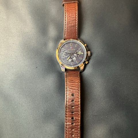 Tommy Hilfiger miesten rannekello, jossa on musta kellotaulu ja musta nahkaranneke. Kellon takakannessa on Tommy Hilfigerin logo ja valmistustiedot. Kellossa on kronografitoiminto ja se on suunniteltu miesten käyttöön. Patteri loppu.