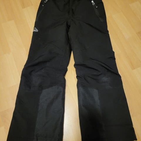 H&M lasten lasketteluhousut sininen väri, koko 134. Housuissa on olkaimet ja ne soveltuvat talviurheiluun tai ulkoiluun lumisissa olosuhteissa. Kuvassa näkyy kulumaa lahkeen alareunassa, lisäksi polvissa on kulumaa ja pienet reiät sekä pepussa on kulumaa ja pieni reikä.