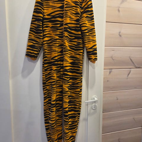 Muutaman kerran käytetty tiikerihaalari joka toimii niin naamiaisasuna kuin kotihaalarina.