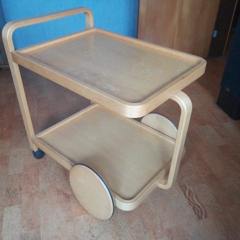 Myydään vanha metallinen sairaalakärry. Soveltuu tarjoilivaunuksi, säilytyshyllyksi tai sivupöydäksi. Ollut Kokkolan Keskussairaalassa 80-90 -luvulla ehkä instrumenttikärry tai joku hoitajan kärry ? Maalattu mattamustaksi. Kaipaa uutta maalipintaa, mutta yleisilme silti oikein siisti varsinkin jos kärryssä tavaraa, jolloin pinnan virheet eivät näkyvillä. Alataso pari senttiä syvempi kuin ylätaso. Syvyys mitattu alatason mukaan. Suht painava mutta ei mitenkään mahdoton nostaa, pyörillä kevyt työntää.
