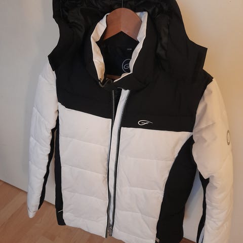 Lähes käyttämätön, musta,Elloksen toppatakki. Koko 158 cm. Pituus olkapäästä takin helmaan n.74 cm. Vyötäröllä säätönarut.