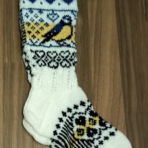 Pitkävartiset, käsin kudotut, sinivalkoiset villasukat n. kokoa 36-38. Teräosan pituus on 24cm ja varren pituus 34cm. Kestää konepesun.