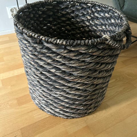 Pyöreä iso punottu kori. Halkaisija n 57 cm, korkeus n 15 cm. Ehjä ja siisti.