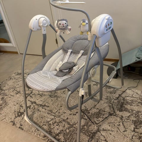 Emma merkkinen koliikkikeinu, vauvakeinu. Toimii pattereilla, monta nopeussäätöä, saa säädettyä musiikkia tai linnunlaulua tms. Saa myös lukittua paikoilleen, ilman heijausta. Muutama lelu tulee mukaan. Lelukaaren saa irti. Kissakoti. Vain nouto.