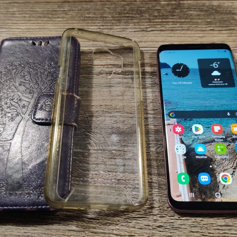 Samsung Galaxy S9+ älypuhelin, jossa on 64 gigatavua tallennustilaa. Puhelin on ruusukullan värinen. Paketti sisältää läpinäkyvän suojakuoren. Laite on käytetty ja taka- sekä etulasi on haljennut. Laite toimii.