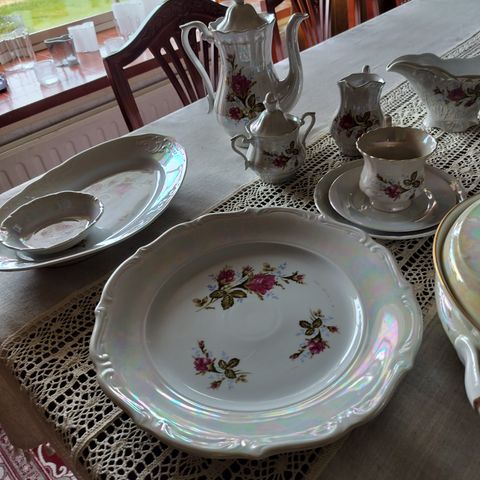 Todella upea käsinmaalattu kullanvärinen pitsiposliini kahvikalusto.