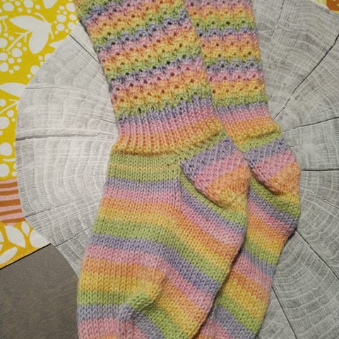 Villasukat, oranssi, jalkaterä 13cm,vastaa n. 22/24 vähän käytetyt.säärystimet moniväriset, pit.20cm, uudet,.molemmat itse kudottuja.h.yht.5e