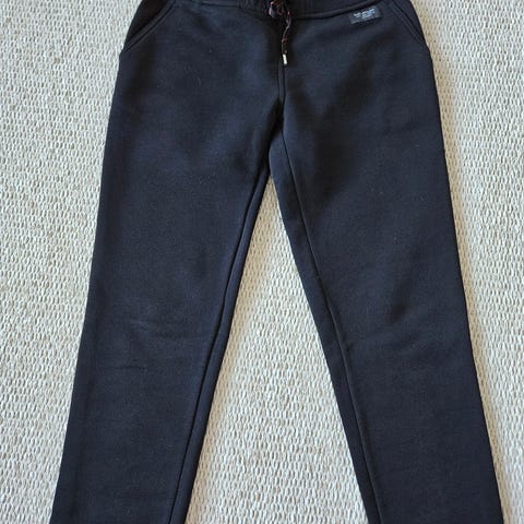 Hyväkuntoiset kerran pestyt collegehousut kokoa L. Lahkeen pituus 80 cm ja vyötärö 88 cm. Vyötäröllä kiristysnauha ja kaksi sivutaskua. Sisältää 80 % puuvillaa, kts. kuva.