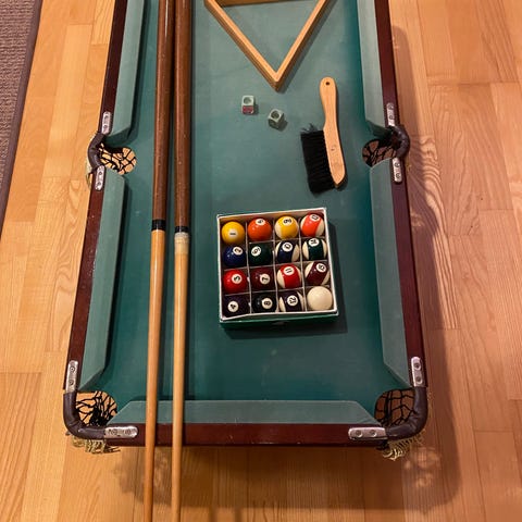 Pelialueen koko 172x80 cm. Kivipöytä. Mailat, pallot ja seinäteline kuuluu mukaan. Ostaja joutuu purkamaan, koska pöytä on todella painava ja sijaitsee yläkerrassa, Tarvittaessa kuljetus nafta kuluja vastaan