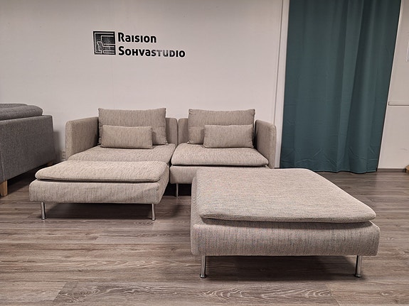 Myynnissä erittäin suuren suosion saavuttanut Ikean Söderhamn sarjan 3:n istuttava sohva käsinojilla. Sohvan runko on ehjä. Päällisten väri: Gunnared keskiharmaa. Päälliset tahrattomat. Sohvan kaikki päälliset ovat irroitettavissa pesuun. Rungon päällinen mukaan lukien. Lisäksi päälliset ovat halutessaan vaihdettavissa. Huomioitavaa sohvan kunnossa: Sohva on ollut koirataloudessa. Puhdistuksesta huolimatta hieman koirankarvoja saattaa löytyä. Ei koiran hajua. Sohvan hinta: 439e. ALENNETTU HINTA: 409e.