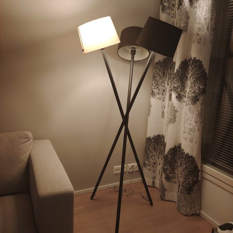 Myydään lattiavalaisin, korkeus 139 cm, varjostimen halkaisija 36 cm ja korkeus 29.