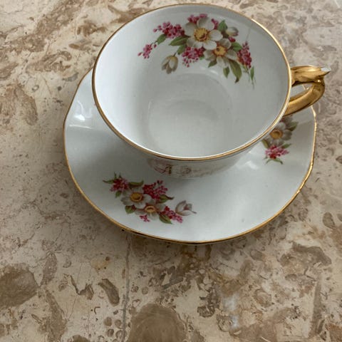 Ruusukuvioinen Äidin kuppi, kultareunuksessa käytön kulumaa, mutta on ehjä. Kupin koko n 3dl . Lautasen reunassa pientä rikamaa. MMM