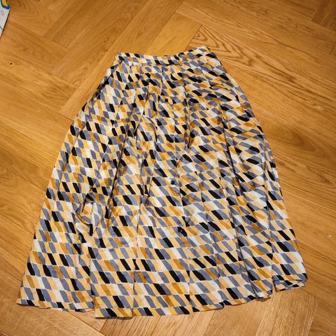 Beige värinen naisten hame, koko S. Hame on valmistettu neulotusta materiaalista, jossa on pystysuuntaiset raidat ja koristeellinen kuviollinen helma. Sopii erilaisiin arki- ja vapaa-ajan asuihin. Uusi käsin tehty