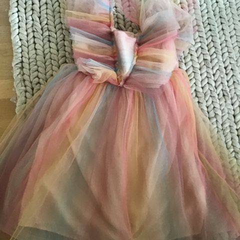 Ihanista ihanin tyllimekko, valkoinen pohjaväri ja leopardikuvioisessa päällyskankaassa vivahde pinkkiä. Hyvät tyllit alushameissa saa mekon helmaan hieman pulleutta ja ilmaa. Käytössä tullut pieniä vikoja, jotka korjattu, mutta tästä seurauksena alahelma ei ole täysin symmetrinen leopardipäällyksen osalta, ks. kuvat.