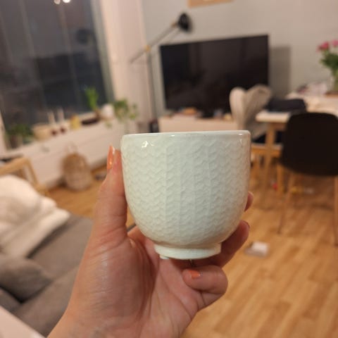 Ruukun korkeus n 6 cm, läpimitta n 8.5 cm pohja n 6.5 cm. Ehjä