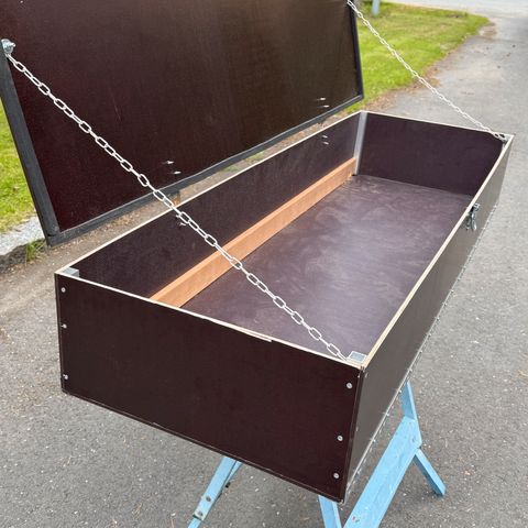 Suksi- ja tavaralaatikko. Rakennettu itse asuntoautoon. Mitat pituus noin 220cm, leveys 80 cm ja korkeus 32 cm.