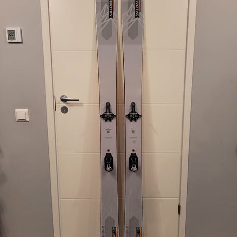 K2 Sidestash vapaalaskusukset Marker Duke siteillä, jotka sopivat myös skinnaukseen. Skinejä suksiin ei ole. Sukset jääneet kolmossuksiksi ja niillä ei ole laskettu puoleenkymmeneen vuoteen, on sen ajan säilytetty kuivassa ja lämpimässä. Siteet toimivat, asetukset 43 koon jalalle. Suksien kantit ovat ehjät, mutta pohjassa muutama vähän isompi osuma, jotka osaava suksien laittaja pystynee paikkaamaan suht näppärästi, kunto huomioitu hinnassa. Tästä muutaman päivän välinevuokran hinnalla sukset joiden kanssa ei tarvitse niin jännittää kivisemmilläkään laskupaikoilla.