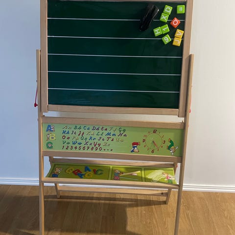 Lasten puinen piirto- ja magneettitaulu, vaaleanpunainen. Taulussa on valkoinen piirtopinta ja musta liitutaulu, pöydällä reiät kynille ja muille tarvikkeille. Mukana värikkäitä magneettikirjaimia. Soveltuu lasten piirtämiseen, kirjoittamiseen ja leikkiin. Taulun korkeus 108cm, leveys 58,5cm, syvyys 55,5cm alareunasta mitattuna)
