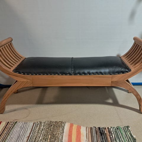 Kaunis viidakkoteeamainen puinen penkki. Ostin joskus vuosia sitten täältä Torista juuri tuunattuna. Päällä muistaakseni servertikoristelu ja lakka päällä. Tosi taidokkaasti tehty.