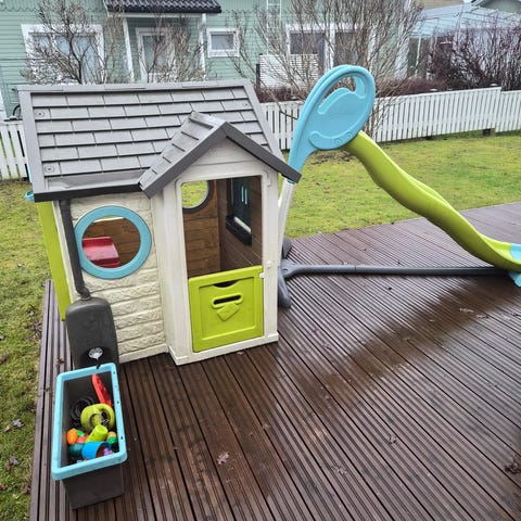 Muovinen leikkimökki. Yksi ovi irronnut, mutta sen saa varmaan kätevä ihminen asennettua takaisin.