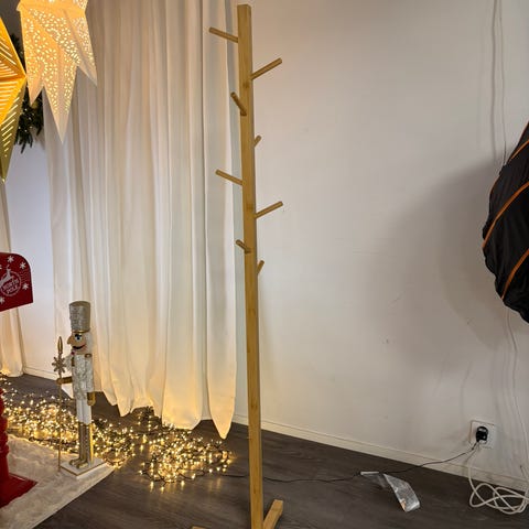 Pystynaulakko mallia Inno 220. Naulakossa kuusi koukkua, hattuteline ja sateenvarjolle tila. Mitat: korkeus 175cm, leveys lattialla (levein kohta) 60cm. Leveys ylhäällä 40 cm.