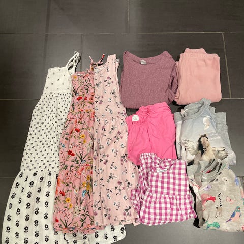 Siisti vaatepaketti tytölle. Trikoomekkoa lukuunottamatta olleet vähällä käytöllä. Mekot H&M 122/128. Collegehuppari (velouriraidat hihoissa) Lindexiltä 128. Collegehame Kappahl 122/128. Trikoopaidat Kappahl 134/140, mutta ovat pientä kokoa. Siniraitaisen paidan oikea väri näkyy parhaiten kuvassa, jossa vaatteet yhdessä pinnassa.