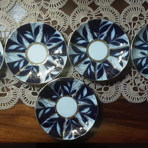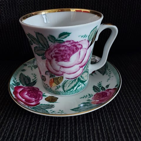 Kahvikuppi ja aluslautanen, ohutta kestävää laadukasta luuposliinia, Lomonosov, löytyy 9 kuppia ja 6 aluslautasta; yhden parin hinta 10e, koko setin 60e.