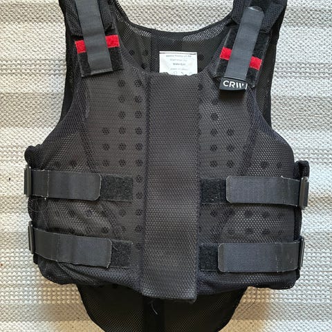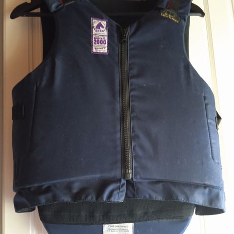 Hyväkuntoinen junioriratsastajan turvaliivi.