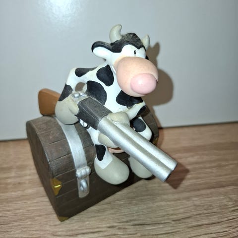 Myydään musta valkoisen lehmä aiheinen säästöpossu. Korkki hukassa.itsellä olnut koristeena hyllyllä.