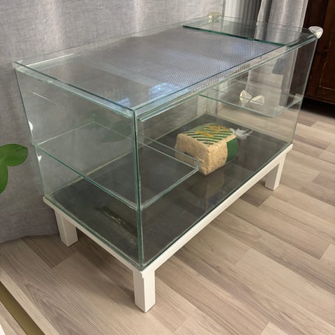 Lasiterraario, ehjä mutta veden pitävyydestä ei tietoa, ollut hamsterilla käytössä. Pituus 80cm ja korkeus 45cm, leveys 35cm, painava on. Hinta 20€