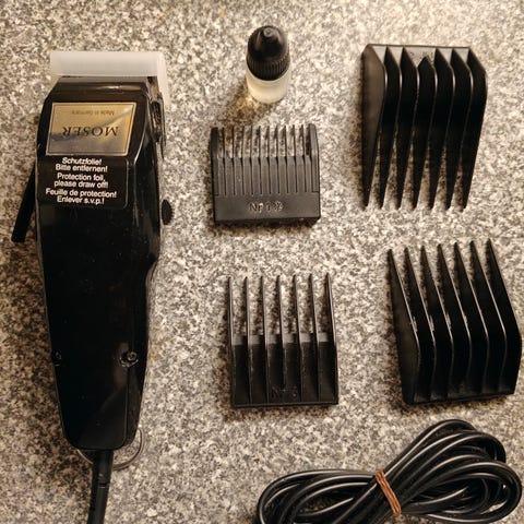 Vanha Moserin trimmeri. Toimiva, mut vaatii välillä trimmauksen alussa terän uudelleen asettelua, jotta lähtee leikkaamaan. En tiedä onko tuo vika itse koneessa vai terässä, mutta itse olen saanut sen toimimaan sitten, kun olen asetellut terää uudelleen paikoilleen. Mukaan saa tuon koneessa olevan Moserin terän, mut se saattaa olla jo melko tylsä.