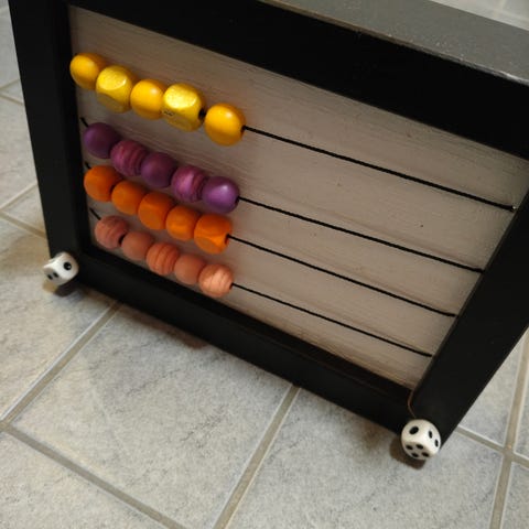 Lasten puinen helmitaulu, jossa on värillisiä helmiä. Helmitaulu on valmistettu puusta ja soveltuu lasten käytettäväksi laskemisen ja laskentataitojen harjoitteluun.
