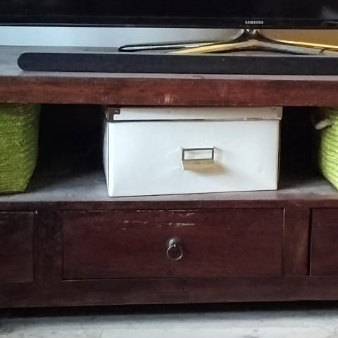 Siisti kokopuinen tv-taso pyörillä. Pöydän kannessa jonkin verran käytön jälkiä.