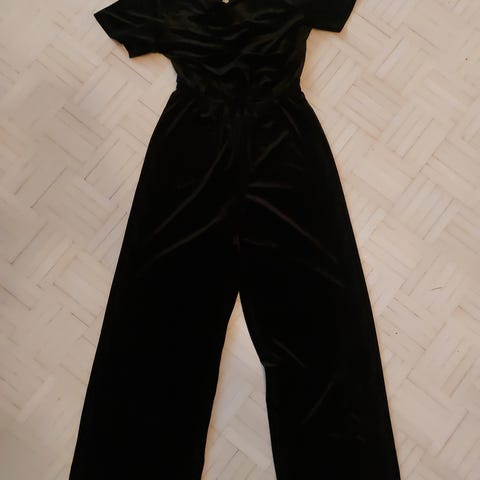KappAhl lasten jumpsuit / haalari juhliin. koko 164 cm. Musta kimaltava kangas. Uusi, vain laput leikattu pois, ei tullut käyttöön. Kuvissa 167cm pitkän tytön päällä, jolle vähän niukka.