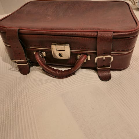 Myydään hyväkuntoinen ruskea nahkainen (tai tekonahkainen) matkalaukku, jossa tukeva kahva ja metallilukko.