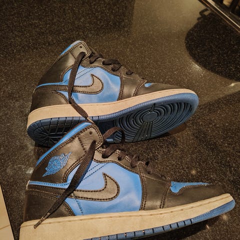 Tuollaiset tosi siistikuntoiset jordanit jääny pieneksi tytölle niin joutaa eteenpäin. Jotain tahraa tai kulumaa voi olla mutta pääpiirteittäin tosi siistit.