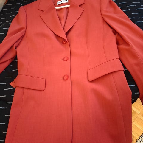 Laadukas 100% PURE NEW WOOL (vuori viscose) vartalonmyötäinen bleiseri. Kirkas karmiininpunainen. Loistavasti sopii joulun aikana. Varanapit. Pituus 80 cm.