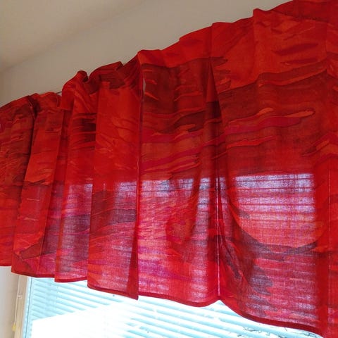 Maija ja Krista Isolan, tulipunainen 100% puuvilla. Pohjassa kirkas keltainen, kuvio oranssi. Postikulut lisätään.