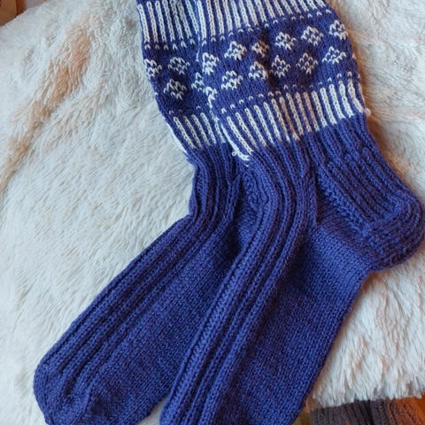 7 veljestä langasta neulotut villasukat. Koko 45-46 Postikulut pakettina lisätään tarvittaessa hintaan.