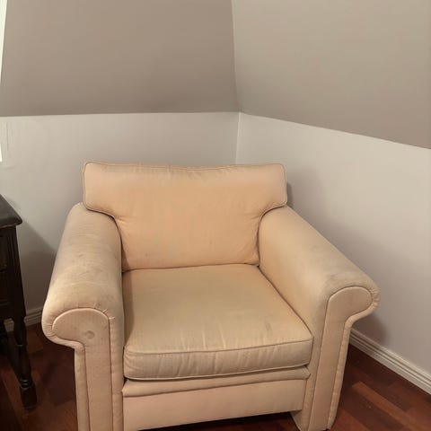 Siistikuntoinen nojatuoli vaalean beigellä buklee-kankaalla, pinta vaatii joistain kohdista pesua. Korkeus 77, leveys 76, syvyys 74. Nouto Laaksolahdesta.